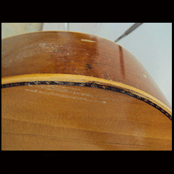 La tapa se abría en favor de las vetas, (ya hubo un arreglo que se ve con maderas más oscuras) para lo cual se utiliza pegando maderitas con las vetas a lo largo de ellas pero en forma transversal de las vetas de la tapa.
