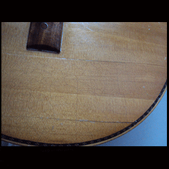 La tapa se abría en favor de las vetas, (ya hubo un arreglo que se ve con maderas más oscuras) para lo cual se utiliza pegando maderitas con las vetas a lo largo de ellas pero en forma transversal de las vetas de la tapa.