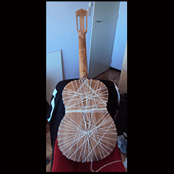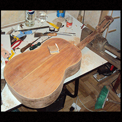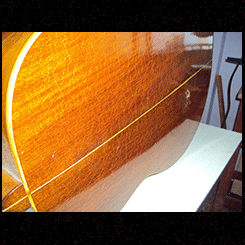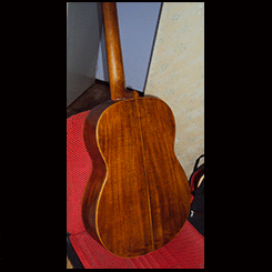 Tenía un barniz antiguo, todo cuarteado, se lijó hasta llegar a la madera y se laqueó con laca nitrocelulosica, la cual es más blanda y acompaña el movimiento y vibración natural de la tapa.